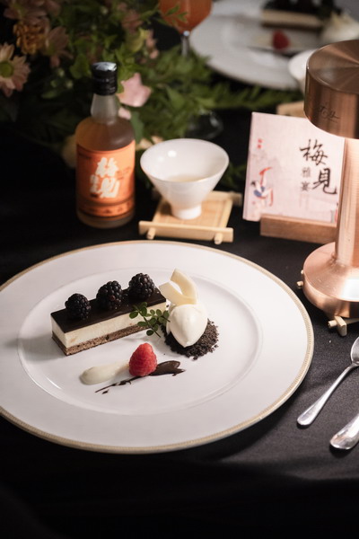 餐后甜品椰浆巧克力慕斯蛋糕和黑莓搭配金梅见提升整体用餐的完整度。