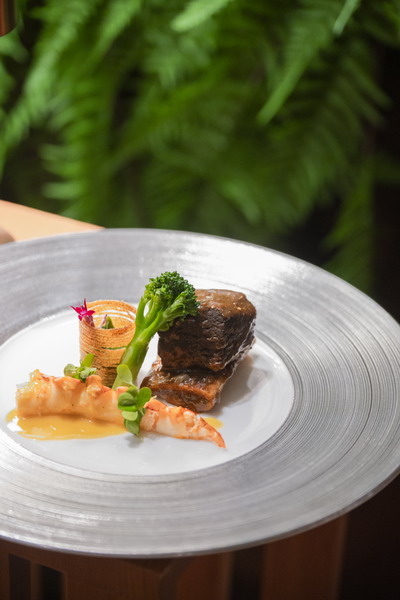 主菜是刃餐厅引以为傲的牛排,由行政副总厨潘师傅呈现的这道水波龙虾尾配12小时黄酒炖澳洲牛肋骨,经黄酒慢炖过的牛肉口感丰富,肉质细嫩,淡淡酒香于舌尖回味,陈皮梅见柑香醇和,层次丰富,微微的药感与牛肉中淡淡的黄酒香气巧妙地融合。